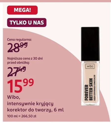 Wibo, intensywnie kryjący korektor do twarzy, 6 ml 100 ml = 266,50 zł 15,99 Korektor Wibo to skuteczny sposób na ukrycie niedoskonałości i zmęczeń skóry. Produkt zapewnia intensywne krycie, dzięki czemu cera wygląda na wypoczętą i promienną. Sprawdza się do maskowania wyprysków, cieni pod oczami i drobnych linii, a jego niewielkie opakowanie (6 ml) idealnie sprawdzi się w podróży. Podobne produkty dostępne są w Rossmannie, warto więc porównać ceny i wybrać najkorzystniejszą ofertę.