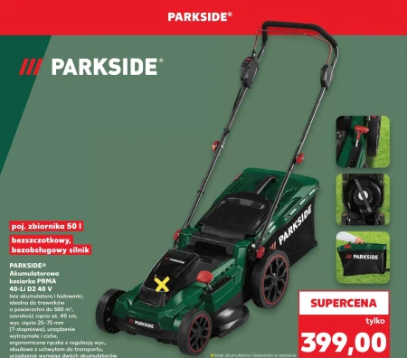 poj. zbiornika 50 l bezszczotkowy, bezoobsługowy silnik PARKSIDE® Akumulatorowa kosiarka PRMA 40-LI D2 40 V bez akumulatora i ładowarki, idealna do trawników o powierzchni do 580 m², szerokość cięcia ok. 40 cm, wys. cięcia 25-75 mm (7-stopniowa), urządzenie wytrzymałe i ciche, ergonomiczna rączka z regulacją wys., obudowa z uchwytem do transportu, urządzenie wymaga dwóch akumulatorów