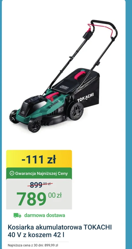 Kosiarka akumulatorowa TOKACHI 40 V z koszem o pojemności 42 litrów jest dostępna w ofercie ERLI w cenie 789,00 zł, dzięki obniżce 111 zł od najniższej ceny z ostatnich 30 dni, wynoszącej 899,99 zł. Ta wygodna w obsłudze kosiarka doskonale sprawdzi się w utrzymaniu schludnego wyglądu trawnika, a zasilanie akumulatorowe zapewnia swobodę ruchów bez plączących się kabli. Darmowa dostawa to dodatkowy powód, by teraz zadbać o swój ogród w atrakcyjnej cenie.