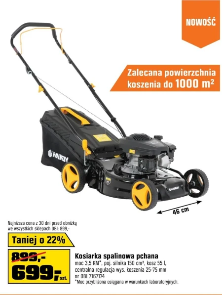 Kosiarka spalinowa pchana moc 3,5 KM*, poj, silnika 150 cm3, kosz 55 l. centralna regulacja wys. koszenia 25-75 mm nr OBI 7167174 *Moc przybliżona osiągana w warunkach laboratoryjnych.