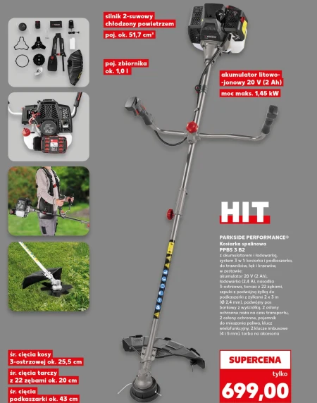 Kosiarka spalinowa PARKSIDE PERFORMANCE® PPBS 3 B2 jest dostępna w ofercie Kaufland w cenie 699,00 zł. To wszechstronne urządzenie 3 w 1 – kosiarka, podkaszarka i narzędzie do pielęgnacji krzewów – sprawdzi się w każdym ogrodzie. W zestawie znajdziesz akumulator, ładowarkę oraz bogaty zestaw akcesoriów, w tym tarcze, szpulę z żyłką, pas barkowy i pojemnik do mieszania paliwa, co ułatwi utrzymanie trawnika i roślin w idealnym stanie. Kosiarka wyposażona jest w silnik dwusuwowy oraz akumulator litowo-jonowy, zapewniający wygodę użytkowania i efektywność pracy, a różnorodne średnice cięcia pozwolą na dostosowanie narzędzia do konkretnych potrzeb. Oferta ważna od 2026-04-09 do 2026-04-15 Źródło: gazetka Kaufland