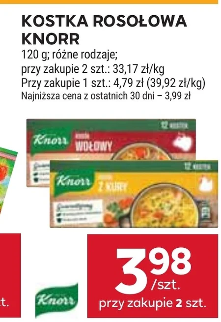KOSTKA ROSOŁOWA KNORR 120 g; różne rodzaje; przy zakupie 2 szt .: 33,17 zł/kg Przy zakupie 1 szt .: 4,79 zł (39,92 zł/kg) Najniższa cena z ostatnich 30 dni - 3,99 zł Aromatyczne kostki rosołowe marki Knorr doskonale sprawdzą się do przygotowania pożywnego rosołu, zupy mясnej oraz jako baza smakowa do wielu potraw. Te skoncentrowane kostki bouillon wzbogacą każde danie o intensywny, głęboki smak i zapach tradycyjnego rosołu domowego.