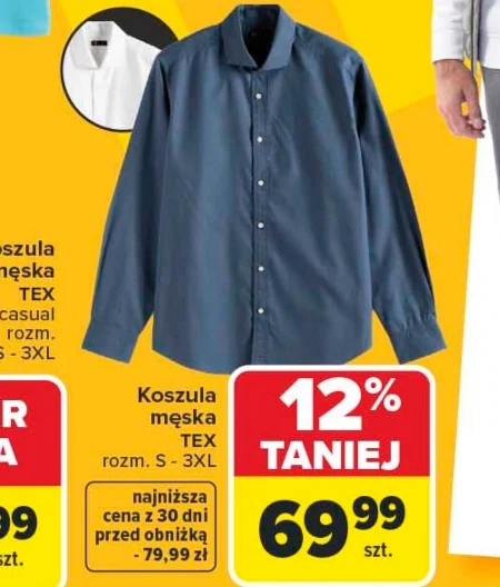Koszula męska TEX w rozmiarach od S do 3XL jest dostępna w ofercie Carrefour w cenie 69,99 zł, co stanowi obniżkę o 12 procent względem ceny sprzed trzydziestu dni wynoszącej 79,99 zł. To klasyczny element męskiej garderoby, który sprawdza się zarówno w sytuacjach formalnych, jak i podczas codziennych obowiązków. Szeroka gama dostępnych rozmiarów pozwala na idealne dopasowanie produktu do sylwetki każdego mężczyzny. Warto skorzystać z tej okazji cenowej, aby uzupełnić szafę o nową koszulę w korzystniejszej kwocie. Oferta ważna od 2026-04-07 do 2026-04-18 Źródło: gazetka Carrefour