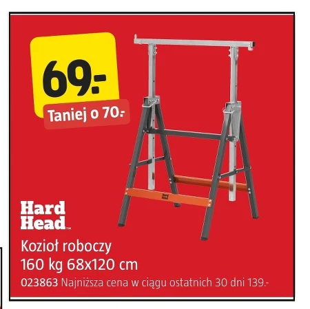 Kozioł roboczy 160 kg 68x120 cm 69:- Taniej o 70:- Hard Head 023863 Najniższa cena w ciągu ostatnich 30 dni 139:- Kozioł roboczy Hard Head o udźwigu 160 kg i wymiarach 68x120 cm to solidne wsparcie podczas prac remontowych i budowlanych. Aktualnie dostępny w atrakcyjnej cenie 69:- zamiast 139:-, co potwierdza gazetka Jula. Sprawdzi się przy cięciu drewna, obróbce metalu czy innych pracach wymagających stabilnego podparcia. To okazja do zaoszczędzenia 70:- na niezbędnym narzędziu.