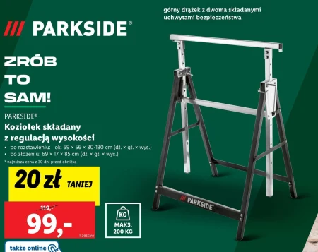 PARKSIDE® Koziołek składany z regulacją wysokości · po rozstawieniu: ok. 69 × 56 × 80-130 cm (dł. x gł. x wys.) · po złożeniu: 69 × 17 × 85 cm (dł. x gł. x wys.)