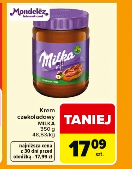 Krem czekoladowy Milka w Carrefour można kupić już za 17,09 zł za słoik o gramaturze 350 g, co daje cenę 48,83 zł za kilogram. Aktualna obniżka sprawia, że to najniższa cena tego produktu w ciągu ostatnich 30 dni – wcześniej kosztował 17,99 zł. Ten gęsty i słodki krem idealnie nadaje się do smarowania pieczywa, dodawania do deserów lub bezpośredniego delektowania się jego smakiem. Skorzystaj z promocji i zaoszczędź prawie złotówkę na ulubionym produkcie.