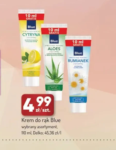 Krem do rąk Blue wybrany asortyment, 110 ml, Delko; 45,36 zł/l 4,99 zł/szt. Krem do rąk Blue to kosmetyk o pojemności 110 ml, dostępny w wybranych wariantach. Produkt marki Delko skutecznie pielęgnuje skórę dłoni. Aktualną ofertę i dostępność kremu Blue warto sprawdzić w najnowszej gazetce Avita, gdzie można znaleźć więcej informacji na temat całego asortymentu Delko. Krem idealnie sprawdzi się do codziennej pielęgnacji, zapewniając dłoniom nawilżenie i komfort.