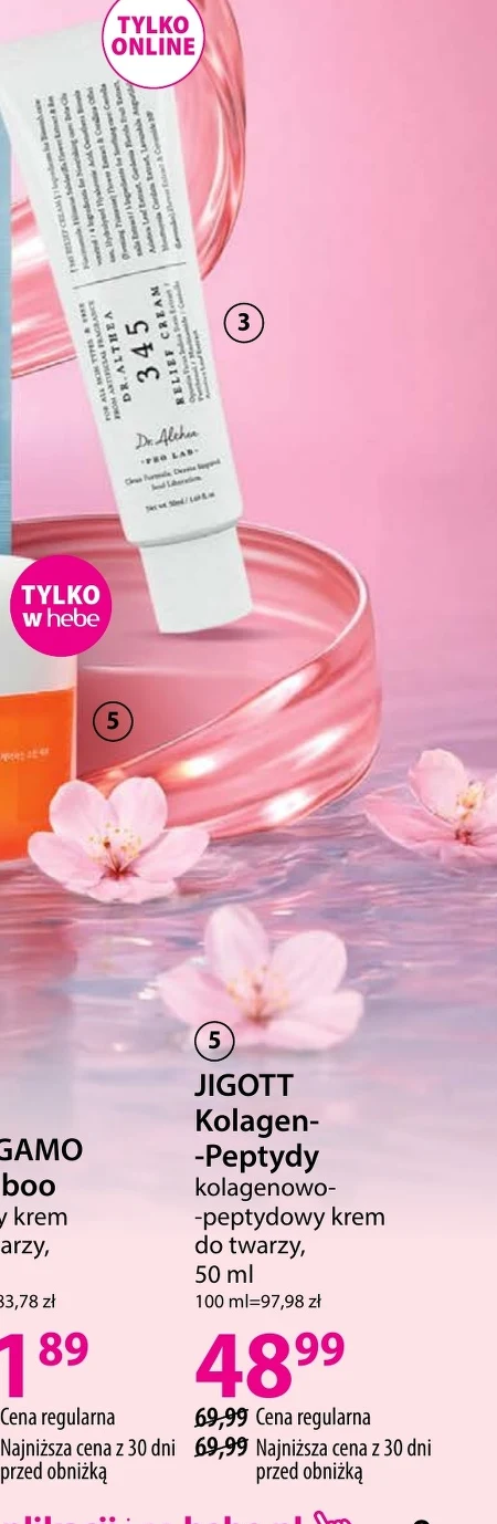 JIGOTT Kołagen-Peptydy krem kolagenowo-peptydowy do twarzy 50 ml w Hebe dostępny jest teraz za 48,99 zł zamiast 69,99 zł. To obniżka z najniższą ceną z ostatnich 30 dni, co oznacza, że aktualnie jest to wyjątkowo korzystna oferta. Produkt ma pojemność 50 ml, co daje cenę 97,38 zł za 100 ml. Krem ten można wykorzystać do codziennej pielęgnacji skóry twarzy.