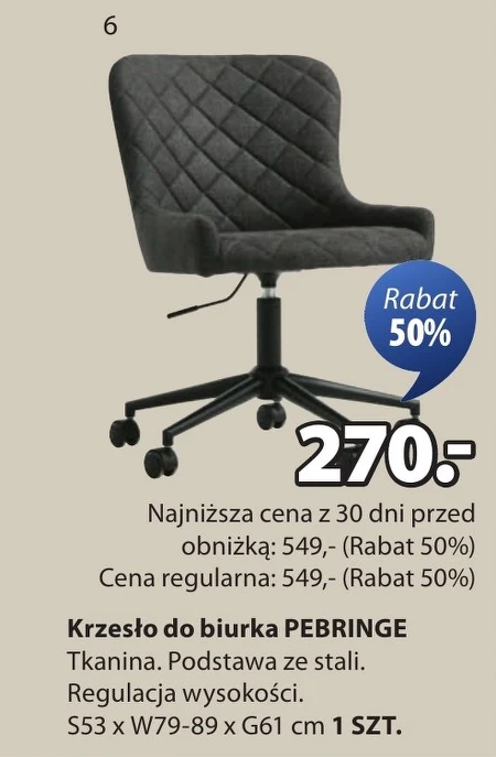 Krzesło do biurka PEBRINGE Tkanina. Podstawa ze stali. Regulacja wysokości. S53 x W79-89 x G61 cm 1 SZT.