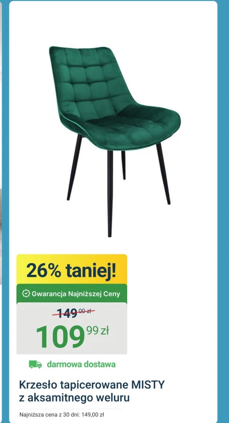 Krzesło tapicerowane MISTY z aksamitnego weluru można nabyć w ofercie ERLI w cenie 109,99 zł, co oznacza 26% zniżki w stosunku do najniższej ceny z ostatnich 30 dni, wynoszącej 149,00 zł, z darmową dostawą. To eleganckie krzesło doskonale sprawdzi się w jadalni, sypialni, a nawet w biurze, wnosząc do wnętrza nutę luksusu i komfortu dzięki miękkiej tapicerce. Obecna okazja to świetna szansa na odświeżenie aranżacji wnętrz bez nadmiernych kosztów, zapewniając sobie jednocześnie wygodne miejsce do siedzenia.