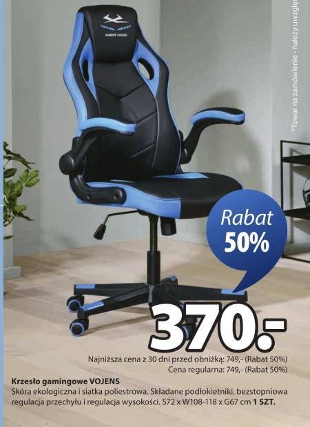 Krzesło gamingowe VOJENS Skóra ekologiczna i siatka poliestrowa. Składane podłokietniki, bezstopniowa regulacja przechyłu i regulacja wysokości. S72 x W108-118 x G67 cm 1 SZT.