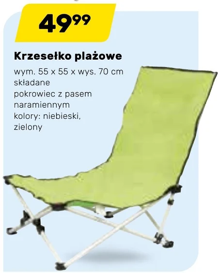 Krzesełko plażowe, wymiary: 55 x 55 x wys. 70 cm. Składane. Pokrowiec z pasem naramiennym. Kolory: niebieski, zielony.