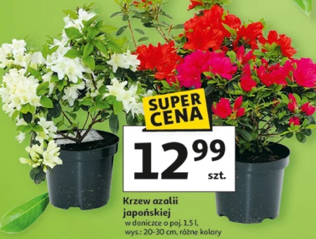 Krzew azalii japońskiej w doniczce o poj. 1,5 l. wys.: 20-30 cm, różne kolory W Auchan znajdziesz teraz krzewy azalii japońskiej w doniczkach 1,5 litra. Rośliny o wysokości 20-30 cm dostępne są w różnych kolorach kwiatów, co pozwala dopasować je do własnego ogrodu lub balkonu. Azalie japońskie to piękna ozdoba, która kwitnie obficie i długo, a także dobrze czuje się w półcieniu. Idealnie sprawdzą się do tworzenia kompozycji roślinnych lub jako samodzielne akcenty.