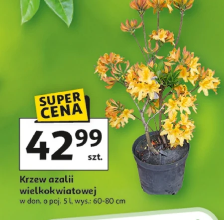 Krzew azalii wielkokwiatowej w don. o poj. 5l. wys.: 60-80 cm Krzew azalii wielkokwiatowej z Auchan to doskonały sposób na wprowadzenie koloru do ogrodu, na balkonie lub tarasie. Roślina o wysokości 60-80 cm, dostarczana w 5-litrowej doniczce, jest gotowa do cieszenia wzrokiem od razu po przyniesieniu do domu. Azalie lubią stanowiska zacienione i kwaśną glebę, a ich piękne, pełne kwiaty sprawią, że ogród zyska wyjątkowy charakter. Idealnie nadają się do tworzenia kompozycji z innymi roślinami kwasolubnymi.