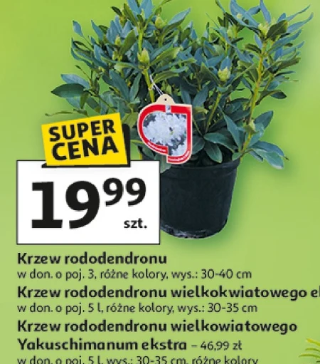 Krzew rododendronu w don. o poj. 3, różne kolory, wys.: 30-40 cm Krzew rododendronu wielkokwiatowego w don. o poj. 5 l, różne kolory, wys.: 30-35 cm Krzew rododendronu wielkokwiatowego Yakushimanum ekstra w don. o poj. 5 l, wys.: 30-35 cm, różne kolory, 46,99 zł W Auchan znajdziesz różnorodne krzewy rododendronów – od klasycznych odmian wielkokwiatowych po popularne Yakushimanum ekstra. Rośliny dostępne są w doniczkach o pojemności 3 i 5 litrów, w różnych kolorach kwiatów i wysokościach 30-40 cm, idealne do zadbania o piękny ogród lub balkon. Rododendrony to doskonały wybór dla miłośników kwitnących roślin, które dodadzą koloru i elegancji każdej przestrzeni.