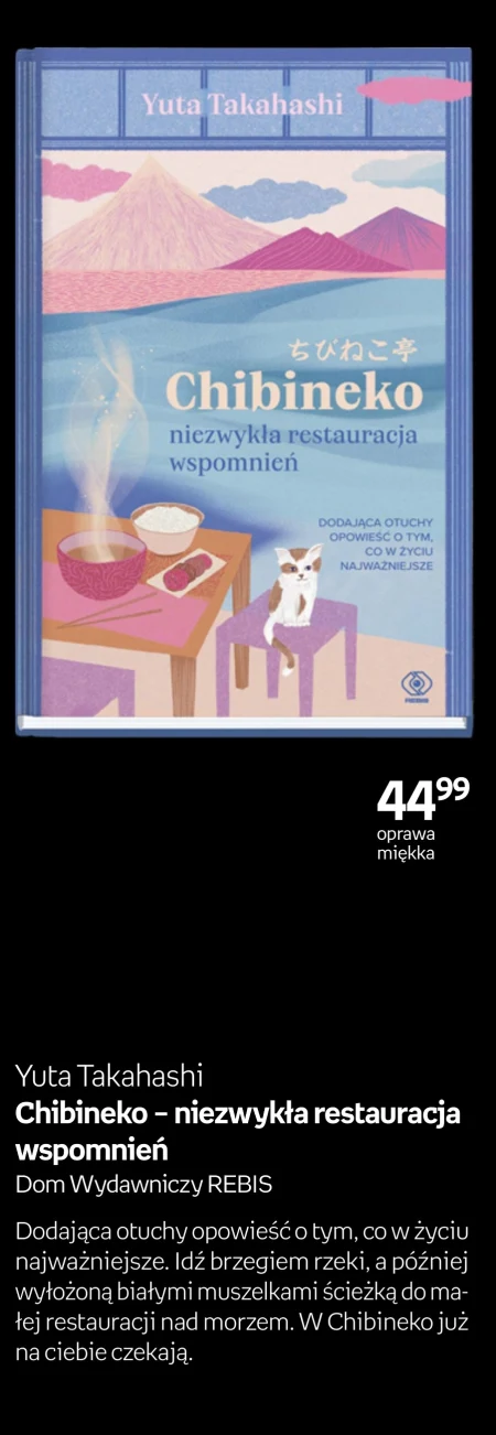 Yuta Takahashi Chibineko - niezwykła restauracja wspomnień Dom Wydawniczy REBIS Dodająca otuchy opowieść o tym, co w życiu najważniejsze. Idź brzegiem rzeki, a później wyłożoną białymi muszelkami ścieżką do ma- łej restauracji nad morzem. W Chibineko już na ciebie czekają.