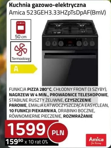 Kuchnia gazowo-elektryczna Amica 523GEH3.33HzpTsDpAF(Bm/V) 50 cm Termoobieg A FUNKCJA PIZZA 280°C, CHŁODNY FRONT (3 SZUBY), NAGRZEW W 4 MIN., PROWADNICE TELESKOPOWE, STABILNE RUSZTY ŻELIWNE, CZYSZCZENIE PAROWE, EMALIA ŁATWOCZYSZCZĄCA EASYCLEAN, 10 FUNKCJI PIEKARNIKA, DRABINKI BOCZNE, RÓWNOMIERNE PIECZENIE, ROZMRAŻANIE