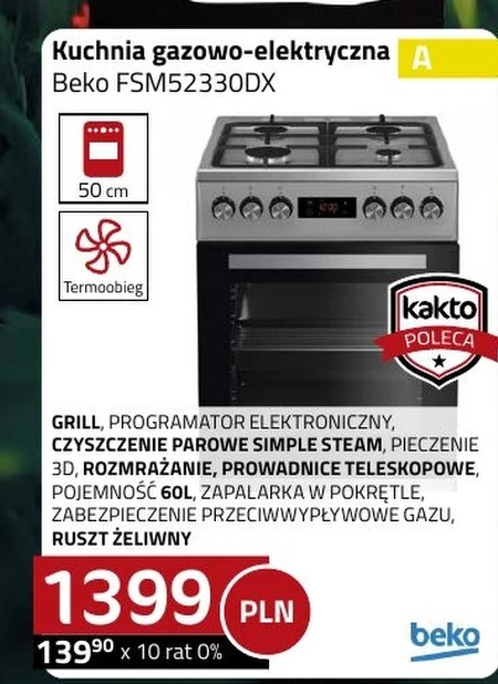 Kuchnia gazowo-elektryczna Beko FSM52330DX GRILL, PROGRAMATOR ELEKTRONICZNY, CZYSZCZENIE PAROWE SIMPLE STEAM, PIECZENIE 3D, ROZMRAŻANIE, PROWADNICE TELESKOPOWE, POJEMNOŚĆ 60L, ZAPALARKA W POKRĘTLE, ZABEZPIECZENIE PRZECIWWYPYŁYWOWE GAZU, RUSZT ŻELIWNY