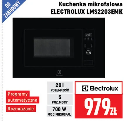 Kuchenka mikrofalowa ELECTROLUX LMS2203EMK w Neopunkcie dostępna jest w cenie 979,99 zł. Model o pojemności 20 litrów i mocy mikrofal 700 W oferuje 5 poziomów mocy oraz programy automatyczne i funkcję rozmrażania. Kuchenkę można wbudować, co oszczędzi miejsce w kuchni i ułatwi utrzymanie porządku.