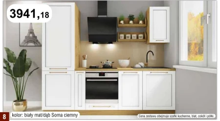 kolor: biały mat/dąb Soma ciemny Cena zestawu obejmuje szafki kuchenne, blat, cokół i półki.