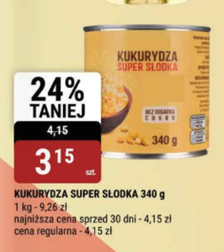 KUKURYDZA SUPER SŁODKA 340 g 1 kg - 9,26 zł najniższa cena sprzed 30 dni - 4,15 zł cena regularna - 4,15 zł