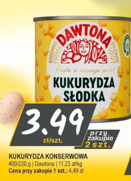 KUKURYDZA KONSERWOWA 400/220 g | Dawtona | 11,23 zł/kg Cena przy zakupie 1 szt.: 4,49 zł 3,49 zł/szt. przy zakupie 2 szt. Kukurydza konserwowa marki Dawtona jest dostępna w markecie Sloneczko w cenie 11,23 zł za kilogram. Puszka zawiera 400 gramów kukurydzy, a waga netto to 220 gramów, a pojedynczy egzemplarz kosztuje 4,49 zł. Kukurydza konserwowa to wszechstronny składnik wielu dań – idealnie sprawdza się w sałatkach, pastach, zupach, a także jako dodatek do pizzy czy innych potraw. Przy zakupie dwóch puszek, cena spada do 3,49 zł za sztukę, co stanowi wyjątkową okazję do uzupełnienia zapasów tej popularnej konserwy.