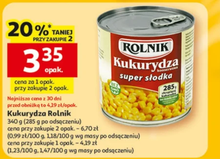 Kukurydza Rolnik 340 g (285 g po odsączeniu) cena przy zakupie 2 opak. - 6,70 zł (0,99 zł/100 g, 1,18/100 g wg masy po odsączeniu) cena przy zakupie 1 opak. - 4,19 zł (1,23/100 g, 1,47/100 g wg masy po odsączeniu)