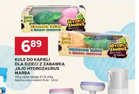 Kule do kąpieli Marba z zabawką Jajo Hydrozaurus dostępne są w Stokrotce w cenie 6,89 zł za opakowanie o gramaturze 165 g. Obecna cena jest niższa niż najniższa z ostatnich 30 dni, wynosząca 6,94 zł, co stanowi niewielką oszczędność. Kule te z zabawką w środku idealnie nadają się, by urozmaicić czas kąpieli dziecka. Sprawdź najnowszą gazetkę promocyjną Stokrotka, aby zobaczyć dostępne rodzaje i upewnić się, że oferta nadal jest aktualna.