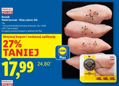 Rzeźnik Polski kurczak - filety z piersi, XXL 1 kg * cena przed obniżką/cena poza promocją: 1 kg = 24,80 Limit: 5 kg na kupon. Szczegóły promocji dostępne w aplikacji Lidl Plus.
