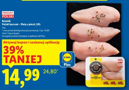 Rzeźnik Polski kurczak - filety z piersi, XXL 1 kg * cena przed obniżką/cena poza promocją: 1 kg = 24,80 Limit: 5 kg na kupon. Szczegóły promocji dostępne w aplikacji Lidl Plus.