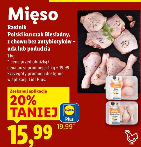 Rzeźnik Polski kurczak Biesiadny, z chowu bez antybiotyków uda lub podudzia 1 kg * cena przed obniżką/ cena poza promocją: 1 kg = 19,99 Szczegóły promocji dostępne w aplikacji Lidl Plus.