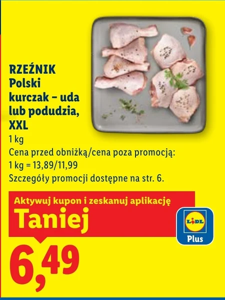 Kurczak RZEŹNIK, polski, uda lub podudzia w rozmiarze XXL, dostępne są w ofercie Lidl w cenie 6,49 za kilogram, po obniżce z 13,89. Ten produkt to doskonały wybór do przygotowania różnorodnych dań, od pieczonych udek po aromatyczne gulasze. Aktywuj kupon i zeskanuj aplikację, aby skorzystać z tej atrakcyjnej ceny. Oferta ważna od 2026-04-13 do 2026-04-15 Źródło: gazetka Lidl