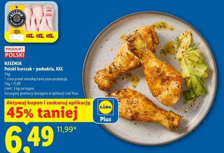Polski kurczak – podudzia, XXL od RZEŹNIKA dostępne są w ofercie Lidl w cenie 6,49 za 1 kg, co oznacza aż 45% zniżki względem ceny 11,99. Podudzia to doskonały wybór dla osób ceniących smaczne i proste dania, idealne do pieczenia, duszenia lub grillowania. Limit zakupu to 3 kg na kupon, a szczegóły promocji znajdziesz w aplikacji Lidl Plus, gdzie można aktywować kupon i zeskanować go przy kasie. Skorzystaj z okazji i zaopatrz się w wysokiej jakości kurczaka w wyjątkowej cenie. Oferta ważna od 2026-04-13 do 2026-04-15 Źródło: gazetka Lidl
