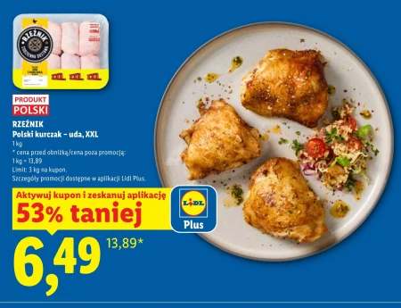 Polski kurczak od Rzeźnika, uda XXL, dostępne są w ofercie Lidl w cenie 6,49 za kilogram, co oznacza aż 53% zniżki względem ceny 13,89. Ten produkt to doskonały wybór dla przygotowania różnorodnych dań, od pieczonych udek po wykwintne gulasze. Limit zakupu to 3 kilogramy na kupon, a szczegóły promocji znajdziesz w aplikacji Lidl Plus, gdzie możesz aktywować kupon i zeskanować go przy kasie. Skorzystaj z tej wyjątkowej okazji i zaopatrz się w wysokiej jakości, polskie mięso w atrakcyjnej cenie. Oferta ważna od 2026-04-13 do 2026-04-15 Źródło: gazetka Lidl