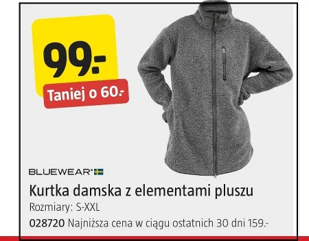 Damska kurtka BLUEWEAR z miękkimi elementami pluszu dostępna w szerokiej gamie rozmiarów od S do XXL. Aktualnie w Jula kurtka jest przeceniona z 159,- na 99,-, co stanowi obniżkę aż o 60,-. To propozycja na chłodniejsze dni, która zapewni komfort i ciepło. Sprawdź najnowszą gazetkę Jula, aby upewnić się, że to najkorzystniejsza oferta.