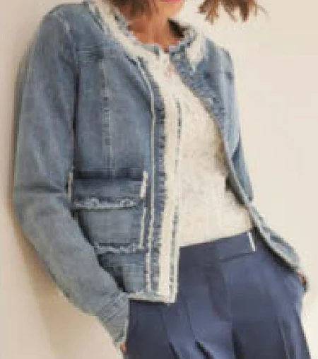 Kurtka dżinsowa z wstawkami z tweedu i perełkami.