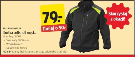 Męska kurtka softshell BLUEWEAR® dostępna w rozmiarach od S do XXXL to idealna ochrona przed wiatrem i lekkim deszczem dzięki słupowi wody na poziomie 3000 mm. Wysoki kołnierz i kieszenie na zamek zwiększają komfort użytkowania. Aktualnie w gazetce Jula kurtka jest przeceniona o 50 zł, co czyni ją wyjątkowo atrakcyjną ofertą, a czarny kolor 021564 pasuje do wielu stylizacji.