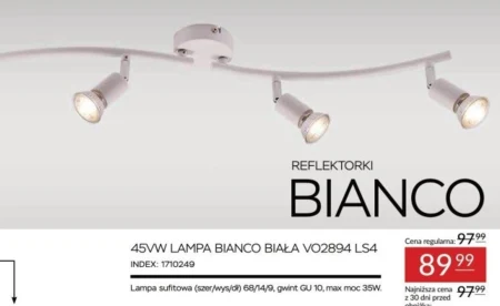 45VW LAMPA BIANCO BIAŁA VO2894 LS4 INDEX: 1710249 Lampa sufitowa (szer/wys/dł) 68/14/9, gwint GU 10, max moc 35W.