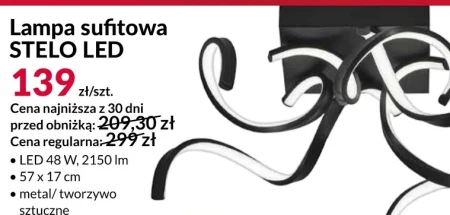 Lampa sufitowa STELO LED 139 zł/szt. Cena najniższa z 30 dni przed obniżką: 209,30 zł Cena regularna: 299 zł LED 48 W, 2150 Im 57 x 17 cm metal/ tworzywo sztuczne Lampa sufitowa STELO LED dostępna w Agacie to teraz świetna okazja – obniżona z 299 zł do 139 zł. Dzięki mocy 48W i jasności 2150 lumenów idealnie sprawdzi się w salonie czy sypialni, zapewniając jasne, a zarazem energooszczędne oświetlenie. Wykonana z metalu i tworzywa sztucznego lampa o wymiarach 57x17 cm doda nowoczesnego charakteru każdemu wnętrzu.