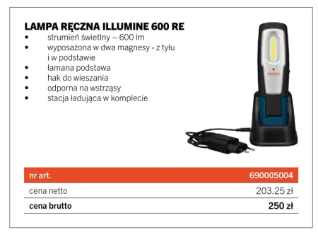 LAMPA RĘCZNA ILLUMINE 600 RE • strumień świetlny – 600 lm • wyposażona w dwa magnesy - z tyłu i podstawie • łamana podstawa • hak do wieszania • odporna na wstrząsy • stacja ładująca w komplecie nr art. 690005004