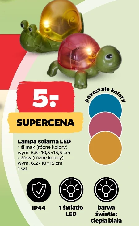 Lampa solarna LED › slimak (rózne kolory) wym. 5,5 × 10,5 × 15,5 cm › Zólw (rózne kolory) wym. 6,2 x 10 x 15 cm 1 szt.