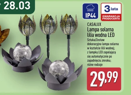 CASALUX Lampa solarna lilia wodna LED Sztuka/Zestaw dekoracyjna lampa solarna w kształcie lilii wodnej; z lampką LED zapalającą się automatycznie po zapadnięciu zmroku; różne rodzaje Dekoracyjna lampa solarna w kształcie lilii wodnej to idealne oświetlenie ogrodowe, które pięknie ozdobi oczko wodne, staw lub rabatę kwiatową. Zasilana energią słoneczną lampka LED zapala się automatycznie po zmroku, tworząc nastrojową, romantyczną atmosferę w ogrodzie bez generowania kosztów za prąd.