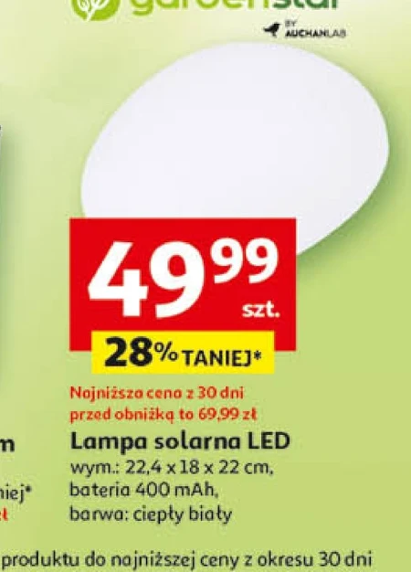 Lampa solarna LED jest dostępna w ofercie Auchan w cenie 4,99 zł, co oznacza 28% taniej niż wcześniej, gdzie cena wynosiła 69,99 zł. To świetna okazja na zakup oświetlenia do ogrodu lub balkonu. Lampa ma wymiary 22,4 x 18 x 22 cm i wyposażona jest w baterię o pojemności 400 mAh, emitującą ciepłe białe światło. Produkt idealnie sprawdzi się do oświetlenia ścieżek, tarasów czy rabat kwiatowych, tworząc przytulną atmosferę po zmroku. Skorzystaj z tej wyjątkowej okazji i dodaj funkcjonalne oraz dekoracyjne oświetlenie do swojej przestrzeni. Oferta ważna od 2026-04-09 do 2026-04-15 Źródło: gazetka Auchan