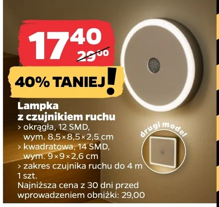 Lampka z czujnikiem ruchu > okrągła, 12 SMD, wym. 8,5×8,5× 2,5 cm > kwadratowa, 14 SMD, wym. 9x9x2,6 cm > zakres czujnika ruchu do 4 m 1 szt. Najniższa cena z 30 dni przed wprowadzeniem obniżki: 29,00