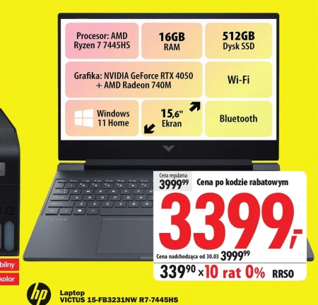 Laptop VICTUS 15-FB3231NW z procesorem AMD Ryzen 7 7445HS i kartą graficzną NVIDIA GeForce RTX 4050 to wydajne urządzenie do gier i wymagających aplikacji. Posiada 16 GB pamięci RAM i szybki dysk SSD o pojemności 512 GB, co zapewnia płynną pracę i komfort użytkowania. Aktualnie w Media Expert dostępny jest w atrakcyjnej cenie z możliwością zakupu na 10 rat 0% RRSO, co czyni go jeszcze bardziej dostępnym dla graczy i osób poszukujących wydajnego laptopa do pracy i rozrywki. Wyposażony w Wi-Fi, Bluetooth i system Windows 11 Home, laptop jest gotowy do użycia od razu po wyjęciu z pudełka.