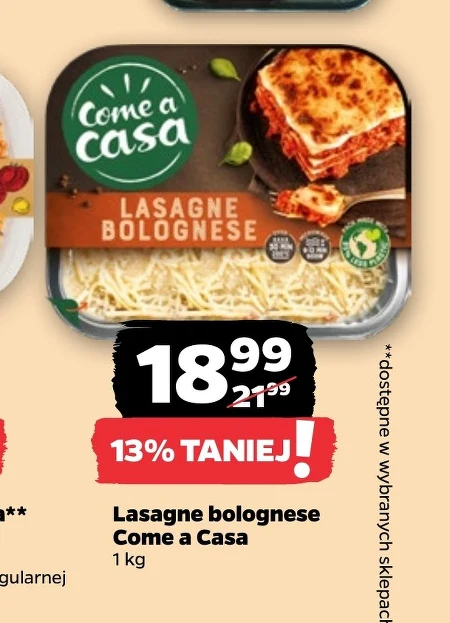 Lasagne bolognese Come a Casa to klasyczne włoskie danie w dużym opakowaniu 1 kg, dostępne w wybranych sklepach. W promocji w cenie 18,99 zł zamiast 21,99 zł – oszczędzasz 13%. Gotowa do podgrzania lasagne z aromatycznym sosem bolognese – doskonały pomysł na szybki i sycący obiad dla całej rodziny.