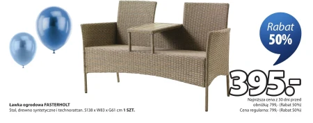 Ławka ogrodowa FASTERHOLT jest dostępna w ofercie Jysk w cenie 395,-, co oznacza 50% rabatu od ceny regularnej 799,-. Produkt wykonano ze stali, drewna syntetycznego i technorattanu, a jego wymiary to 5138 x 83 x 61 cm. Ta solidna ławka ogrodowa idealnie sprawdzi się w Twoim ogrodzie lub na tarasie, zapewniając wygodne miejsce do wypoczynku na świeżym powietrzu. Połączenie trwałych materiałów gwarantuje odporność na warunki atmosferyczne i długotrwałe użytkowanie. To wyjątkowa okazja, aby zaoszczędzić i cieszyć się komfortem w swoim ogrodzie. Warto skorzystać z obniżki i stworzyć przyjemną strefę relaksu na zewnątrz. Oferta ważna od 2026-04-22 do 2026-05-10 Źródło: gazetka Jysk