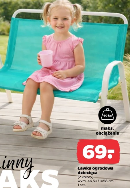 Ławka ogrodowa dla dzieci jest dostępna w ofercie Netto w cenie 69,-. Produkt występuje w dwóch kolorach i idealnie sprawdzi się w ogrodzie, na balkonie lub tarasie, oferując maluchom miejsce do zabawy i odpoczynku. Ławka ma wymiary 46,5 x 71 x 58 cm i wytrzymuje obciążenie do 60 kg, zapewniając bezpieczeństwo podczas użytkowania. To świetna okazja, aby stworzyć dzieciom przytulną przestrzeń do spędzania czasu na świeżym powietrzu. Źródło: gazetka Netto