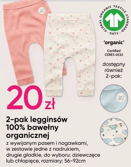 2-pak legginsów 100% bawełny organicznej. Do wyboru: chłopięce i dziewczęce rozm. 56-92 cm