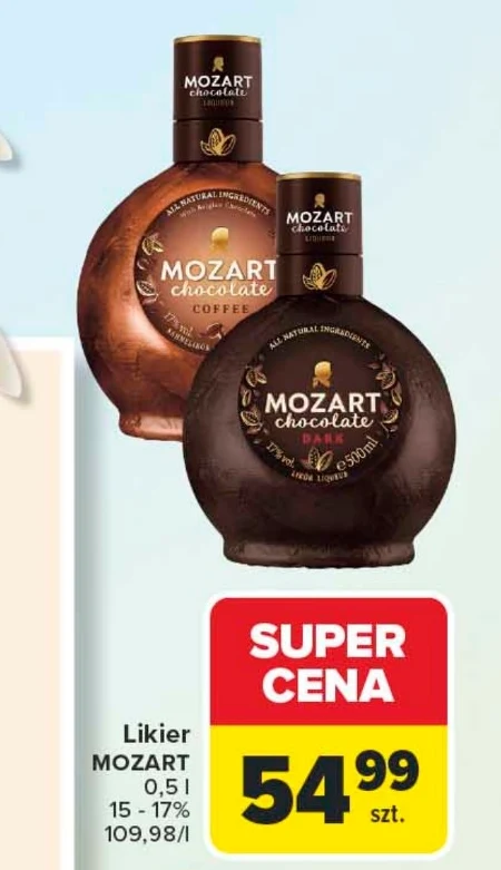 Likier Mozart 0,5 l dostępny jest w Carrefour w cenie 54,99 zł za butelkę, co daje 109,98 zł za litr. Aktualna promocja w Carrefour to SUPER CENA – sprawdzona okazja dla osób szukających alkoholi w dobrych cenach. Ten likier o zawartości alkoholu 15-17% idealnie nadaje się do przygotowania drinków lub delektowania się nim w czystej postaci. Warto sprawdzić gazetkę Carrefour, aby upewnić się, że oferta nadal jest aktualna.